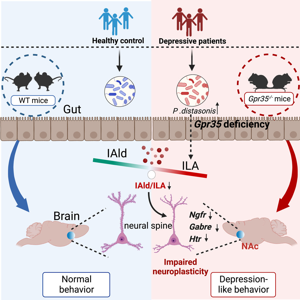 为了探索肠道Gpr35突变诱导脑与行为异常的远程调节机制,该团队通过代谢组学分析发现伏隔阂等关键脑区中微生物来源的色氨酸代谢物发生重构,尤其是吲哚甲醛(IAld)的减少和吲哚-3-乳酸(ILA)的增多;基于前期建立的代谢组-微生物组时空关联策略及单菌定植筛选,团队进一步发现Parabacteroides distasonis可诱导抑郁样行为并诱导IAld与ILA比例的失衡。研究团队进一步发现灌胃补充ILA可诱导抑郁样行为,而补充IAld则明显改善慢性应激小鼠及肠上皮Gpr35缺陷小鼠的抑郁样行为;比较转录组学分析表明其差异作用机制富集于突触传递与神经可塑性相关因子,且与Gpr35敲除小鼠脑区变化一致。最后,团队通过临床合作研究证实在抑郁症患者中血清IAld水平显著降低,粪便中Parabacteroides distasonis丰度升高,且二者均与抑郁量表评分密切相关,为拓展抑郁症的外周生物标志物及潜在药物干预途径提供了科学依据。该研究首次报道肠上皮细胞Gpr35调控菌群色氨酸代谢平衡进而参与抑郁行为发生的作用与机制,并发现补充活性代谢产物吲哚-3-甲醛可有效改善精神应激或基因突变小鼠的抑郁样行为。
