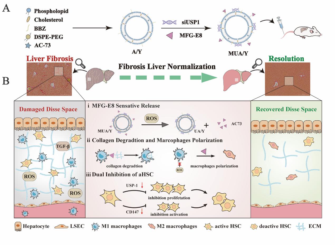 晚期肝纤维化中,髓源巨噬细胞被招募至肝脏后极化为促炎表型并分泌促炎因子维持肝脏炎症环境,同时炎症诱导肝星状细胞增殖和活化及细胞外基质沉积,导致纤维化严重程度加剧。然而,由于巨噬细胞表型调节的难度和复杂性,以及细胞外基质屏障导致的治疗效果不足,目前仍没有有效的策略来调节巨噬细胞。针对该问题,姜虎林教授团队构建一种基于调控自体巨噬细胞表型转化的脂质纳米颗粒(MUA/Y),诱导巨噬细胞向抗炎表型转化并训练其成为原位胶原清除器,同时诱导肝星状细胞静息,三管齐下实现晚期肝纤维化的治疗。