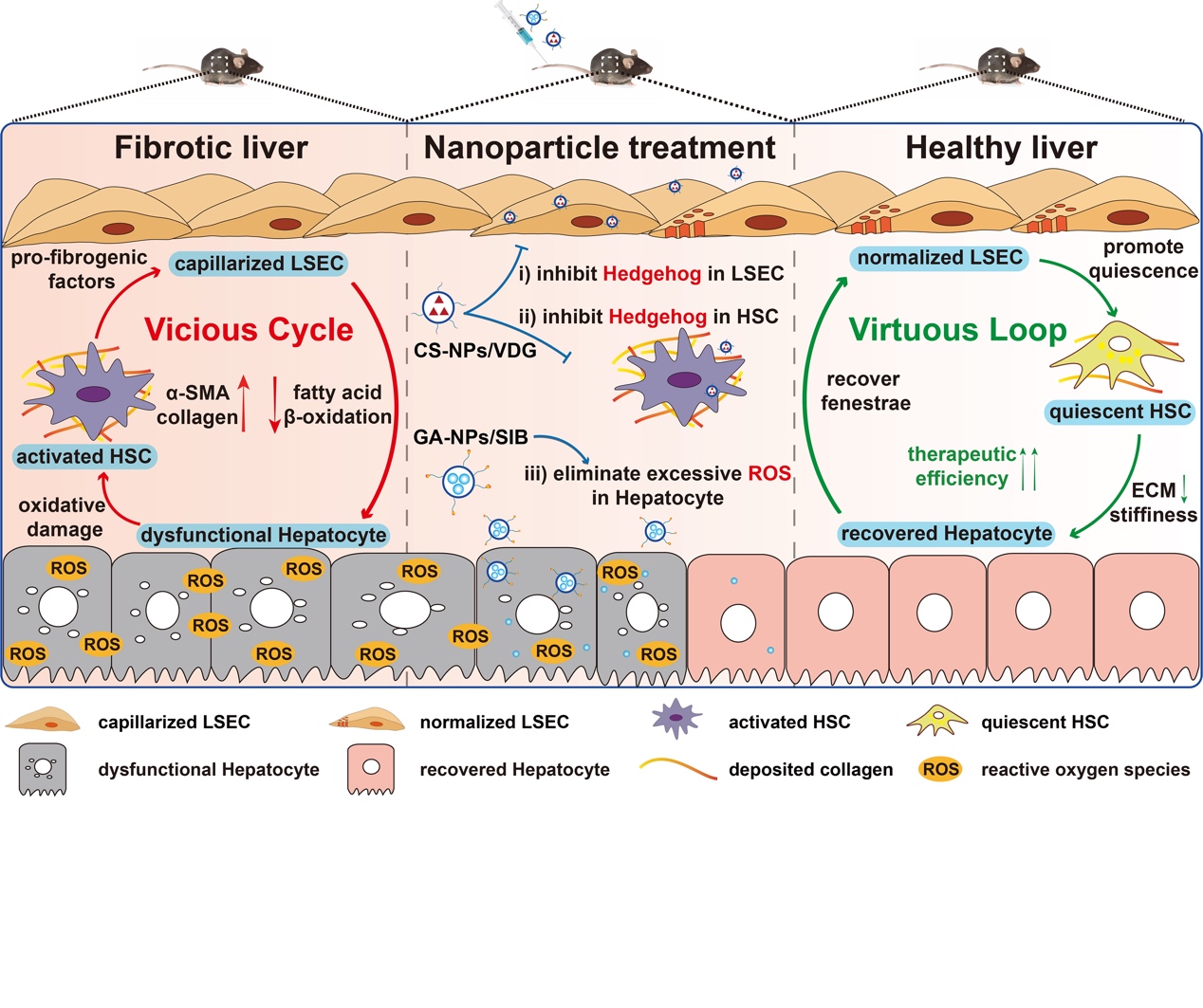 针对肝纤维化条件下“毛细血管化的肝窦内皮细胞-活化的肝星状细胞-功能失常的肝实质细胞”相互作用构成恶性循环的病理特点,该团队构建恶性循环逆转型药物递送系统。CS-NPs/VDG调节肝窦内皮细胞,恢复分化表型,同时促进肝星状细胞转变至静息态,GA-NPs/SIB清除过度生成的活性氧并促进肝实质细胞功能正常化,最终成功逆转肝纤维化病理微环境,恢复细胞良性循环,实现有效治疗。