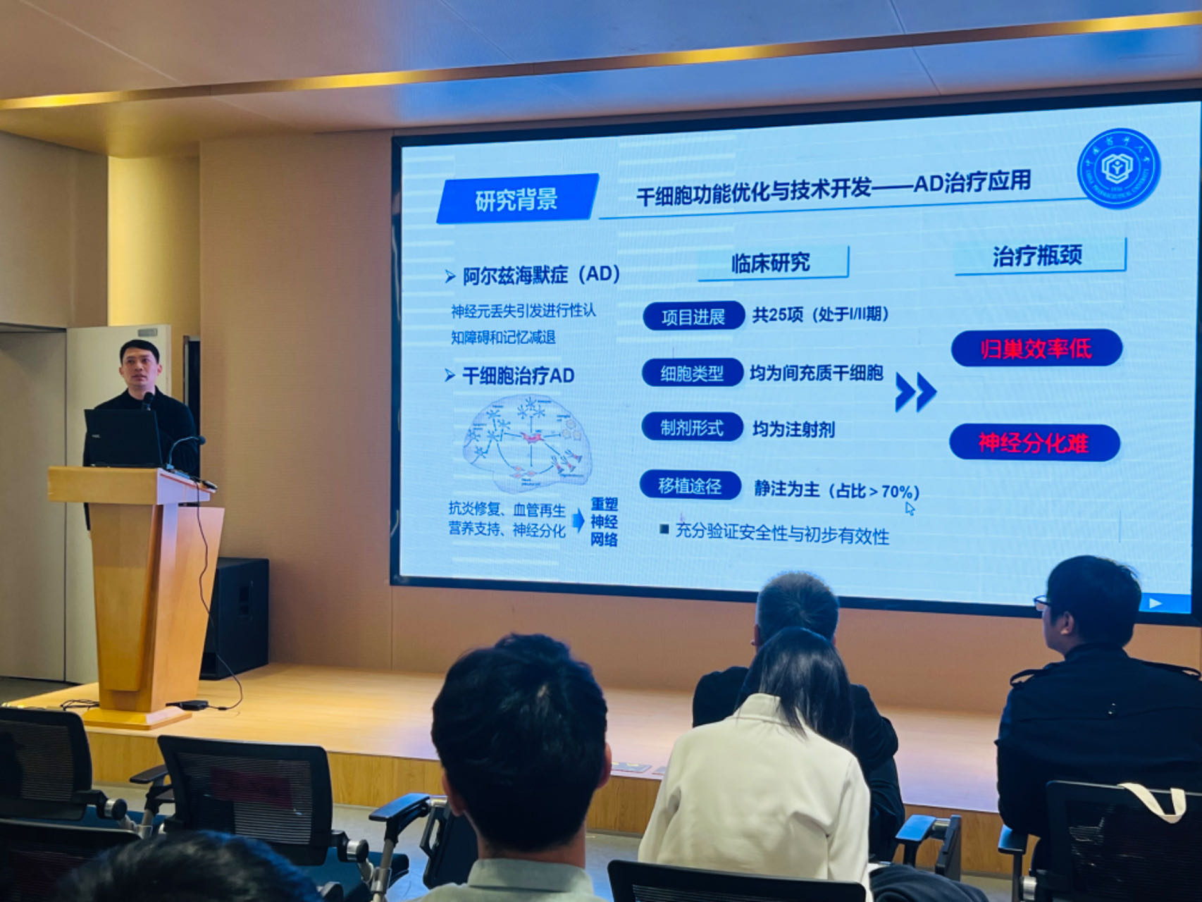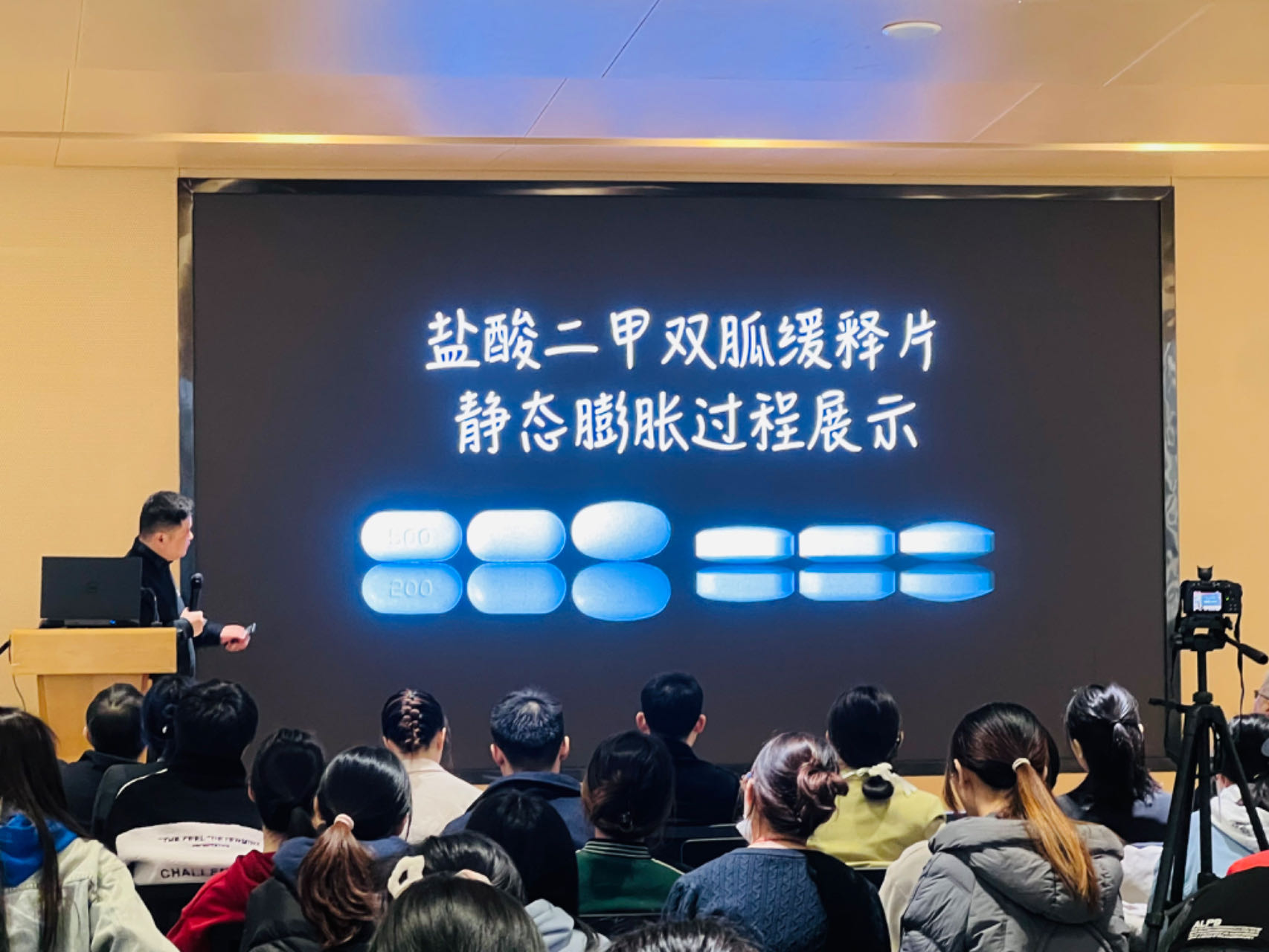 首先,四川大学华西太阳成集团tyc7111cc邓黎副教授和公司太阳成集团tyc7111cc药剂系副主任丁杨教授受邀先后作专家报告。邓黎副教授以“可视化技术用于固体制剂崩解释放特性的探索”为题,详细介绍并动画演示了如何利用可视化技术探索固体制剂崩解释放特性,阐述了药品研究创新的新方向,为在场观众呈现了一场视觉盛宴。丁杨教授以“干细胞疗法应用基础研究与转化思考”为题,围绕归巢效率低和神经分化难两个治疗瓶颈,介绍了研究团队在相关领域取得的重要成果。参会师生与两位专家进行了深入交流,现场气氛热烈。