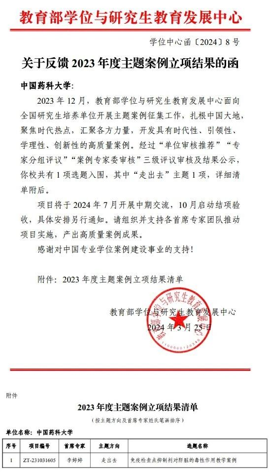 近日,教育部学位与研究生教育发展中心2023年主题案例征集评审结果揭晓,公司太阳成集团tyc7111cc李婷婷副教授申报的案例《免疫检查点抑制剂对肝脏的毒性作用教学案例》获得立项。