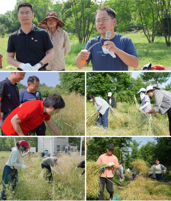 基建后勤处夏锦鉴副处长、陈嘉裔老师与玄武园林绿化养护老师为师生演示镰刀的使用方法和收割油菜的正确姿势,并强调安全注意事项。