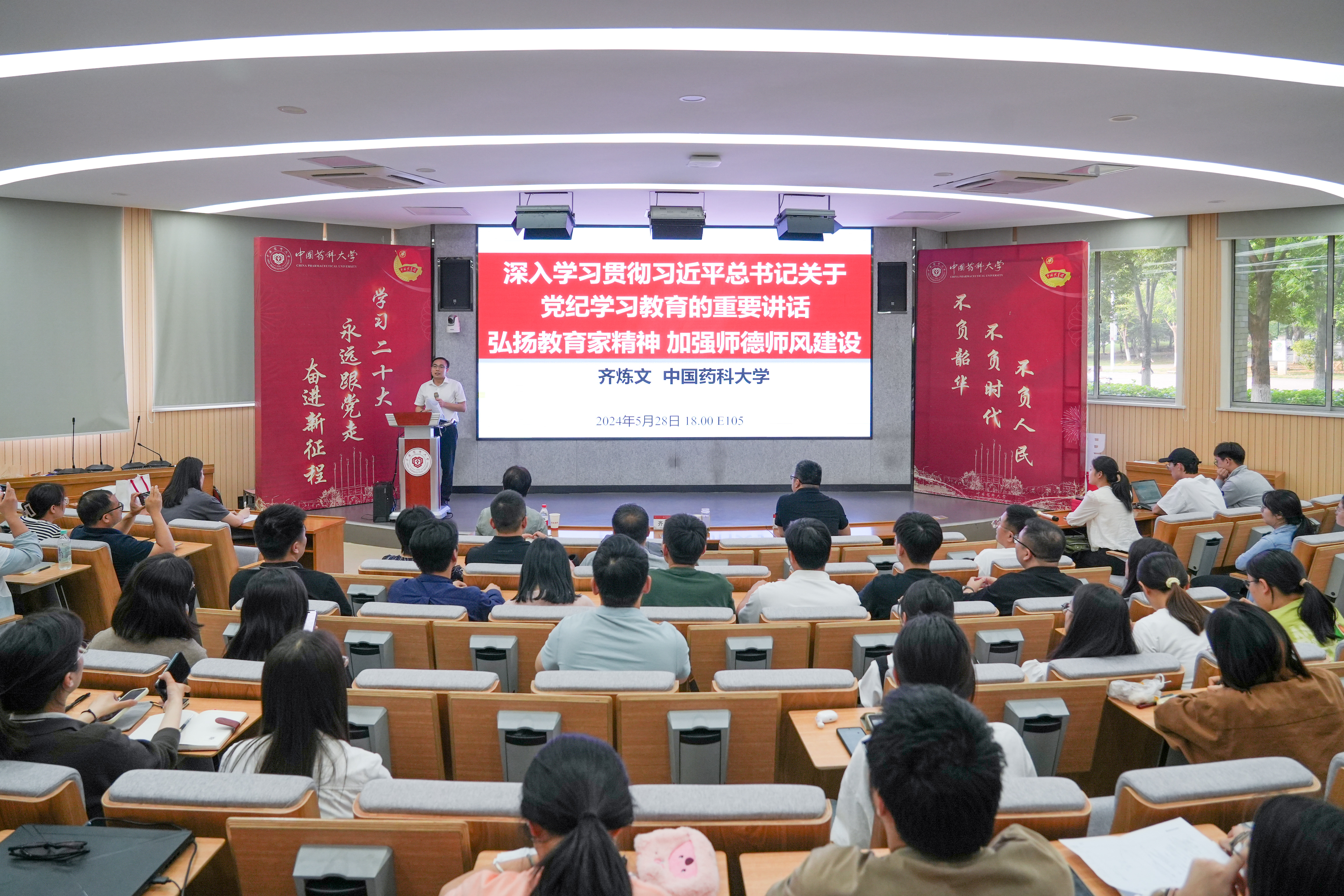 5月28日,副董事长齐炼文在教学楼E105面向太阳成集团tyc7111cc师生开展了以“深入学习贯彻习近平总书记关于党纪学习教育的重要讲话,弘扬教育家精神,加强师德师风建设”为主题的专题讲座。讲座由药公司党委书记张仕英主持,药公司党委副书记孟祥康、全体党支部书记、齐董事长联系党支部和班级师生、近三年入职教师等150余人参加活动。