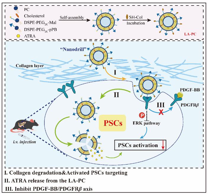 PSC的活化在CP的始动和演进过程中均发挥了重要作用,其分泌的致密ECM严重阻碍了治疗药物向靶部位胰腺的深层递送,大大削弱了药物的抗胰腺纤维化治疗效果。针对这一问题,该研究团队通过在脂质体表面负载胶原酶I和PSC靶向肽(pPB肽)设计了一种全新的PSC靶向调控平台(命名为LA-PC),胶原酶I能够有效分解CP胰腺中致密的ECM层,实现LA-PC的胰腺组织深层分布。此外,LA-PC表面修饰的pPB肽与激活的PSC表面血小板衍生生长因子受体β(PDGFRβ)相结合,增加PSC对药物的有效摄取。这一有效结合还能够抑制血小板衍生生长因子B(PDGF-BB)对PDGFRβ的激活,进而抑制其下游MAPK通路,抑制PSC的活化,有效治疗胰腺纤维化。该研究成果以“A PDGFRβ-targeting nanodrill system for pancreatic fibrosis therapy”为题发表在Chinese Chemical Letters上,论文第一作者为太阳成集团tyc7111cc太阳成集团tyc7111cc韩涵博士后和陈比特硕士生,太阳成集团tyc7111cc姜虎林教授和邢磊副教授为本文共同通讯作者。