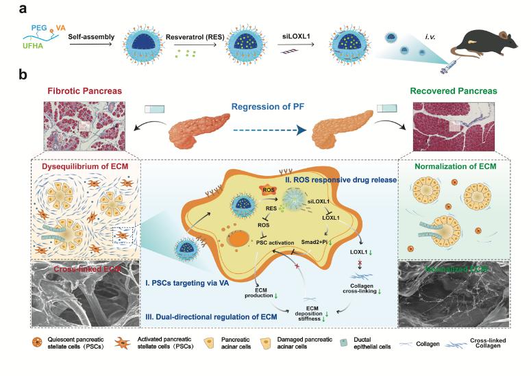 胰腺纤维化主要表现为胰腺星状细胞(PSC)持续激活,引起胶原过度沉积导致的细胞外基质(ECM)稳态失衡。而且过度沉积的胶原会形成病理屏障,严重阻碍药物的有效递送。针对上述问题,姜虎林教授团队前期已设计并制备胶原结合肽和胶原酶I共修饰的双重载药脂质体(命名为AT-CC),用于胰腺纤维化治疗(Biomaterials 2023, 292, 121945)。在此基础上,团队进一步构建PSC靶向调控制剂,清除积聚的ROS,抑制PSC激活,同时抑制胶原交联,促进ECM降解,协同重塑基质与微环境稳态平衡。该研究成果以“Reactive oxygen species-responsive nanoparticles toward extracellular matrix normalization for pancreatic fibrosis regression”为题发表在Advanced Science上,东南大学医公司祁靓博士和太阳成集团tyc7111cc段博文博士生为论文共同第一作者,太阳成集团tyc7111cc太阳成集团tyc7111cc姜虎林教授、美国加州大学Stephen J. Pandol教授和东南大学附属中大医院李玲教授为本文共同通讯作者。