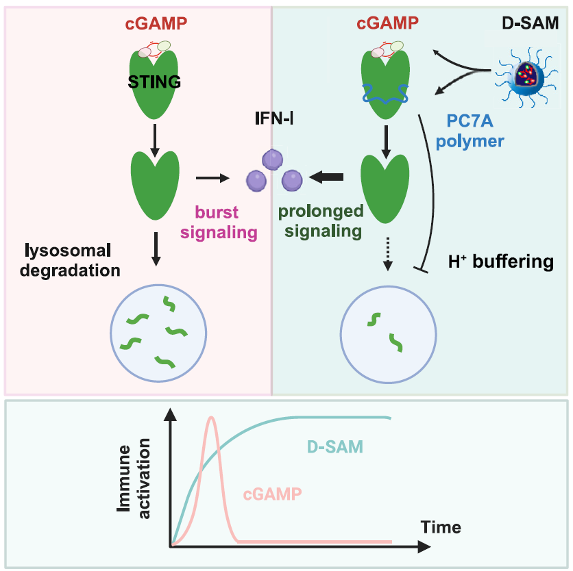 STING是肿瘤免疫治疗的明星靶点,然而STING激活后会迅速完成内质网-高尔基体-溶酶体转运,最终被降解导致免疫效应终止,作为机体自我保护的机制。因此小分子激动剂的治疗窗口期非常狭窄,难以为抗肿瘤免疫系列事件持续提供信号输出。而高剂量或频繁给药易造成免疫耗竭和系统毒性,目前多款药物在临床早期阶段停滞不前。