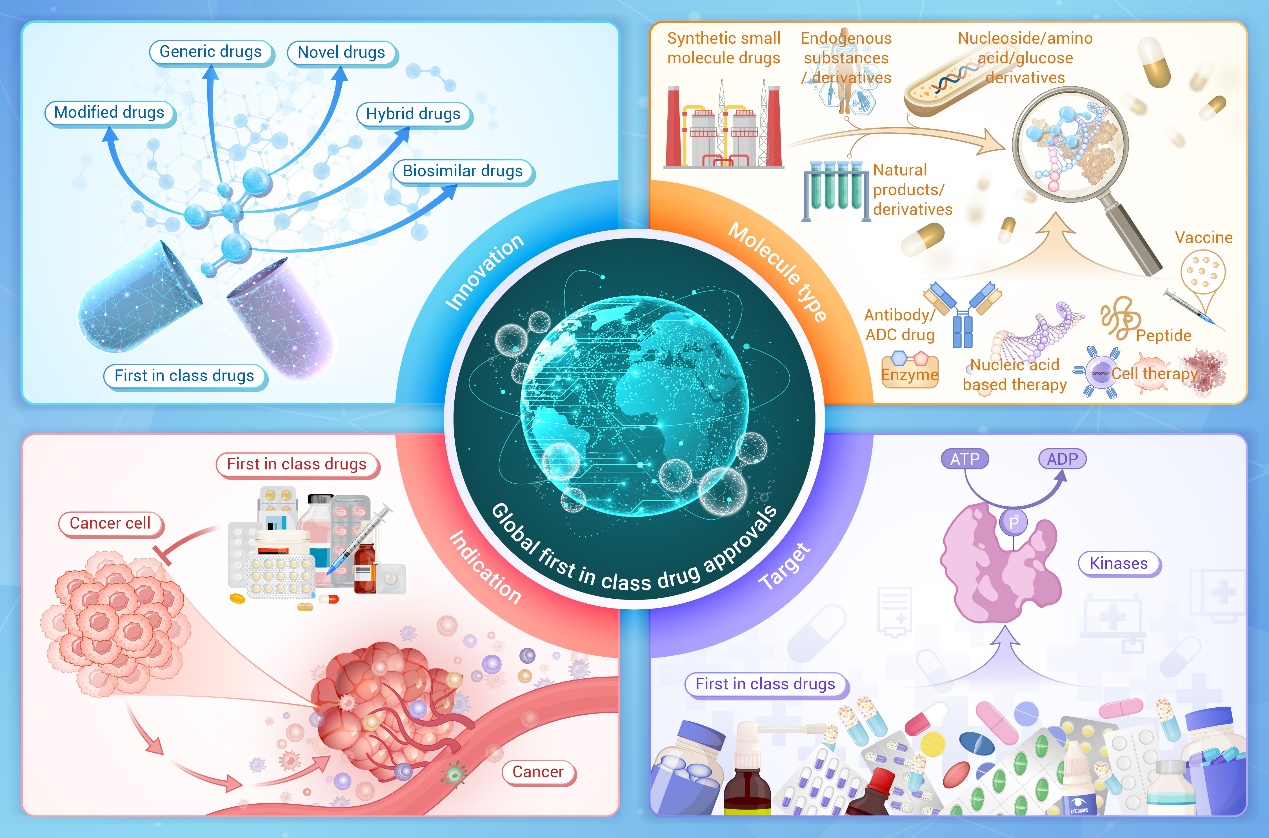 近日,公司太阳成集团tyc7111cc王磊/尤启冬团队在知名学术期刊The Innovation(IF: 33.2)上在线发表了题为“Global first-in-class drugs approved in 2023-2024: Breakthroughs and insights” 的综述文章,阐述了2023-2024年间全球首创性小分子药物的突破与进展。太阳成集团tyc7111cc2024级直博生翟代超、副教授张秋月为本文的共同第一作者;太阳成集团tyc7111cc药物化学系王磊研究员、尤启冬教授,海军军医大学基础医公司卢小玲教授为本文共同通讯作者;太阳成集团tyc7111cc为本论文的第一通讯单位。