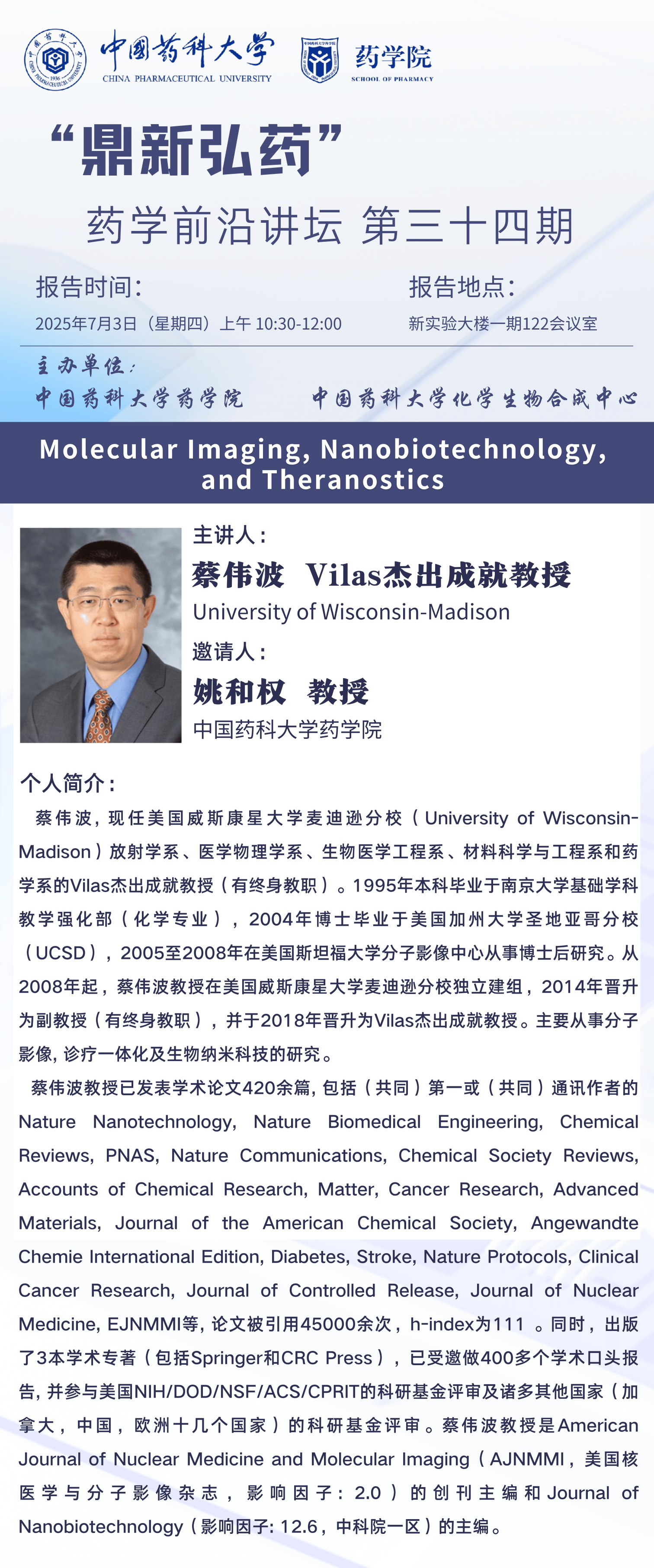 “鼎新弘药”药学前沿讲坛第三十四期通知