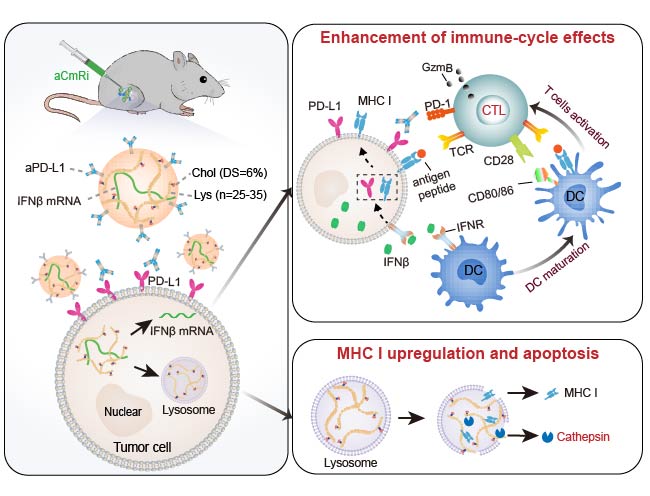 为在提升联合免疫疗效的同时最大限度地降低毒副作用,该研究构建了一种新颖、简单且通用的人工跨膜寡肽平台:以胆固醇修饰的寡聚赖氨酸(CPL)为纽带,将IFNβ mRNA与抗PD-L1单克隆抗体(aPD-L1)整合成复合物颗粒(aCmRi)。其核心优势在于CPL通过膜相互作用直接将mRNA送入胞质,绕过经典溶酶体途径,提升mRNA 转染效率;同时,CPL增强了肿瘤细胞溶酶体的通透性,促进肿瘤细胞凋亡并上调MHC I的表达;表面锚定的aPD-L1拉近了颗粒与肿瘤细胞距离,并阻断肿瘤细胞表面的PD-L1,与原位表达的IFNβ产成协同作用。该工作为解决IFNβ的非特异性靶向和体内毒副作用提供了解决方案,并为提升体内肿瘤免疫治疗的有效性、选择性和安全性,提供了一种简单而通用的mRNA治疗方法。