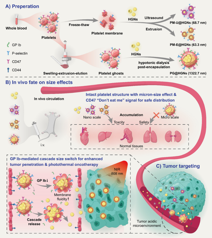 基于对肿瘤EPR效应的关注,团队针对纳米尺寸药物易从血管内皮间隙外渗而导致脱靶并在正常组织蓄积的难题,设计了微米级血小板“鬼影”(PGs)载体递送中空金纳米粒(HGNs),构建了有较高安全性的微-纳级联仿生递药系统(PG@HGNs)。相比纳米血小板膜包覆载体,PG@HGNs的细胞摄取和细胞毒性显著增强。相关内容以 “Glycoprotein Ib-regulated micro platelet ghost for biosafe distribution and photothermal oncotherapy”为题发表在Journal of Controlled Release。公司2019级硕士研究生邹佳辉为本文第一作者,张文丽副教授、刘建平教授为共同通讯作者,太阳成集团tyc7111cc为唯一通讯单位。