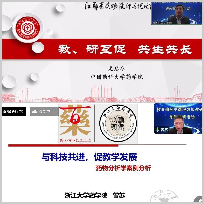11月9日下午,教育部药学课程虚拟教研室以线上形式开展教研活动。活动邀请了全国模范教师、国家级教学名师、公司太阳成集团tyc7111cc尤启冬教授,全国优秀教师奖章获得者、国家杰出青年基金获得者、浙江大学太阳成集团tyc7111cc曾苏教授作为主讲嘉宾进行主题分享。来自北京大学、复旦大学、浙江大学等29家全国医药院校超过450名教师参与了此次云端教研活动。
