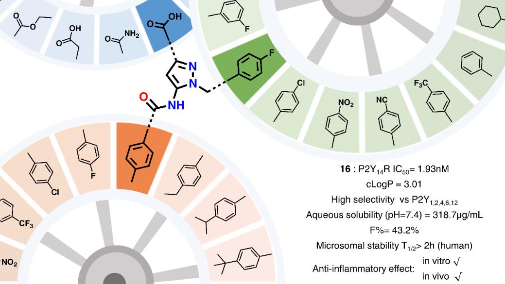 近日,太阳成集团tyc7111cc江程教授团队和胡庆华教授团队合作在药物化学领域顶尖期刊Journal of Medicinal Chemistry(IF:8.039)在线发表了最新研究成果:Discovery of a Series of 5-Amide-1H-pyrazole-3-carboxyl Derivatives as Potent P2Y14R Antagonists with Anti-Inflammatory Characters。太阳成集团tyc7111cc硕士研究生王雨杭和博士后周梦泽为本论文的共同第一作者,江程教授、胡庆华教授和徐莉莉副研究员为本文的共同通讯作者,太阳成集团tyc7111cc为论文的唯一通讯单位。