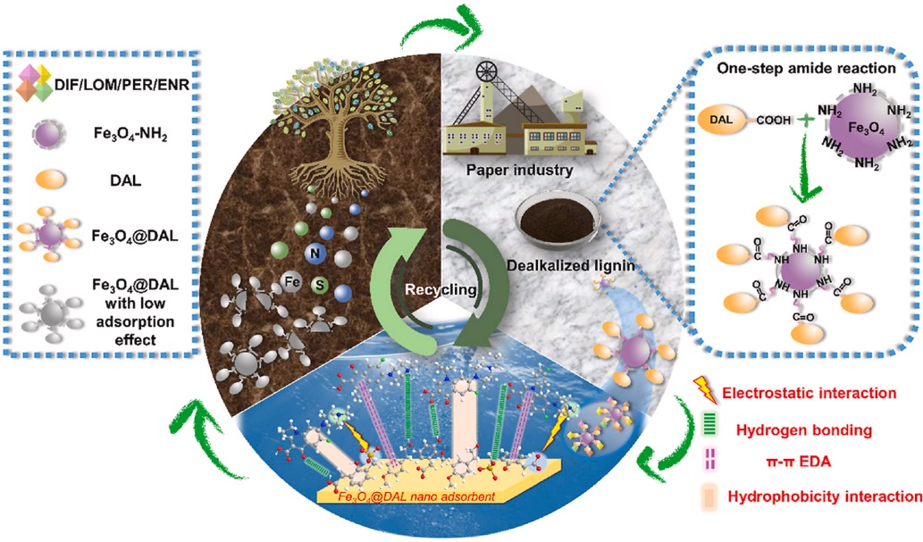 抗生素在畜牧业和农业中的使用导致水体中抗生素的过度排放,长期可能导致耐药并对生态产生影响。研究团队开发了一种绿色环保型吸附材料:脱碱木质素接枝磁性纳米粒(Fe3O4@DAL),用于环境水体中氟喹诺酮类抗生素的去除。Fe3O4@DAL将磁性纳米粒子的高效分离性能与可再生木质素活性官能团丰富的结构特点相结合,具有催化过硫酸盐对氟喹诺酮类抗生素进行氧化降解的能力。回收后的吸附剂仍可作为肥料缓释剂二次利用。相关工作以“Designing Degradable Lignin-grafted Magnetic Nano-composite Materials for Cost-effectively Sustainable Removal of Fluoroquinolone Antibiotics from Environmental Water”为题发表于Journal of Cleaner Production。公司2020级硕士研究生侯思妤为本文第一作者,纪顺利副教授为本文的通讯作者,太阳成集团tyc7111cc为本文的第一通讯单位。