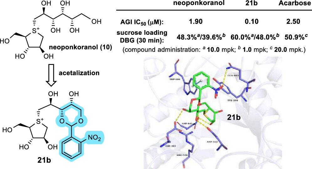 从五层龙属植物根部提取的锍鎓盐类活性天然产物具有新颖独特的化学结构,研究表明其对α-葡萄糖苷酶抑制活性功效与同类上市药物阿卡波糖、伏格列波糖相当,包含这些天然活性分子的五层龙提取物已经被开发成用于降糖、减肥的健康食品在日本上市。与之相关的全合成以及结构修饰一直是药物化学和有机合成化学领域的研究热点。课题组近年来围绕该领域进行较为深入地研究,开发了高效的合成方法(Angew. Chem. Int. Ed. 2019)。在此基础之上,为了突破国外化合物专利,课题组保留了天然产物中结构保守性区域,运用骨架跃迁策略通过在其侧链片段引入环状的苯甲缩醛结构,设计合成了一系列新型的锍鎓盐类α-葡萄糖苷酶小分子抑制剂。大部分小分子抑制剂体外酶抑制活性比同类口服降糖药物高出数十倍。在小鼠体内的降糖实验中,化合物21b表现出超强的降糖能力,同为20mg/kg的治疗组中,21b表现出远高于阿卡波糖的降糖活性,当把给药剂量降低到到1mg/kg时,21b的降糖能力仍然与阿卡波糖(20mg/kg)对照组相当。初步的毒理实验也表明21b具有良好的安全性。21b也成为迄今为止发现的降糖活性最强的锍鎓盐类α-葡萄糖苷酶抑制小分子。此项工作为该类多手性中心、结构保守性非常高的天然产物的结构修饰和新药开发提供了重要的研究思路。