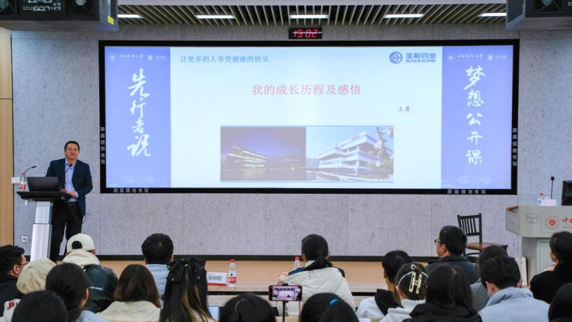 讲座中,王勇先生以自己的成长故事及由此得到的感悟为主题,与在座师生分享了自己的人生经历及创业故事。王勇先生从理想出发,向同学们分享了自身从梦想到现实、从建筑到医药转变中的心路历程,阐述了爱一行、干一行、钻一行、精一行之间的联系,勉励同学们要怀抱梦想,脚踏实地。他回顾了圣和药业的创业史,以人类健康为己任,以质量安全为保证,向同学们介绍了圣和药业的时代责任与历史使命。他阐释了自己坚持创新、坚持研发原创性新药的原因,展示了圣和药业的强大生命力和丰厚成果,鼓励同学们要有敢想敢为、善作善成的勇气和决心。王勇先生“勤奋成就事业”的人生经历蕴含着中流击水的干劲,更饱含携手并进的精神。