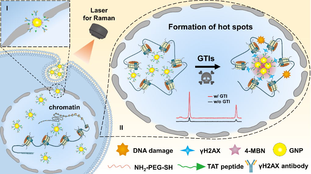 γH2AX是细胞核内染色质组蛋白H2AX第139位丝氨酸的磷酸化产物,在短时间内于受损DNA周围限域高表达,是遗传毒性评价的重要生物标志物。本研究以γH2AX作为限域靶标,采用高专属性和非侵入性表面增强拉曼光谱(SERS)技术,构建了一种γH2AX的核靶向金纳米免疫探针,用于评估药物杂质的遗传毒性。具有DNA损伤特征的遗传毒性杂质能够诱导探针的免疫识别并原位自聚集形成热点,产生增强的拉曼信号以指征遗传毒性强弱,实现单细胞水平的原位实时检测,为药物工艺过程安全性控制提供技术支持。