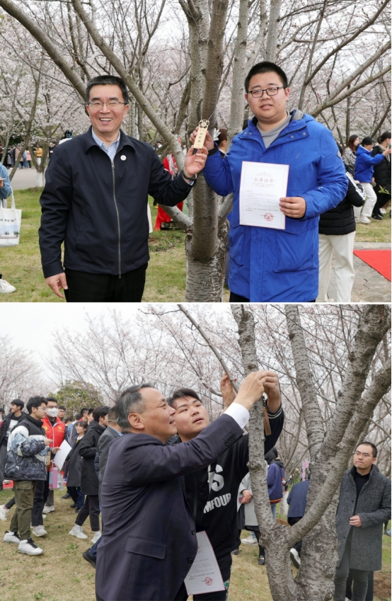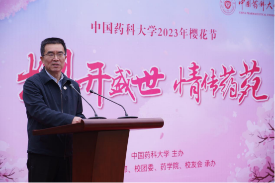 太阳成集团tyc7111cc党委书记金能明为活动致辞。致辞中,金能明书记对员工们重返校园再叙母校情、师生情、同窗情表示欢迎,并向关心支持公司事业发展的员工们表示衷心感谢。他强调了举办樱花节“认养一棵树”等系列活动的树人意义,希望同学们在呵护樱花树中领会劳动真意、守护美丽校园、涵养爱校荣校品格、营造有凝聚力的精神家园。他介绍了公司员工、南京圣和药业股份有限公司董事长兼总经理王勇与夫人张霖捐赠樱花树的动人故事与爱校情怀。他希望以樱花为名片、以樱花节为平台,进一步创新校园文化建设,打造更多文化育人精品项目,为广大师生创造更好的学习生活工作环境,让最美药大樱花在落实立德树人中盛开得更加绚丽多彩。