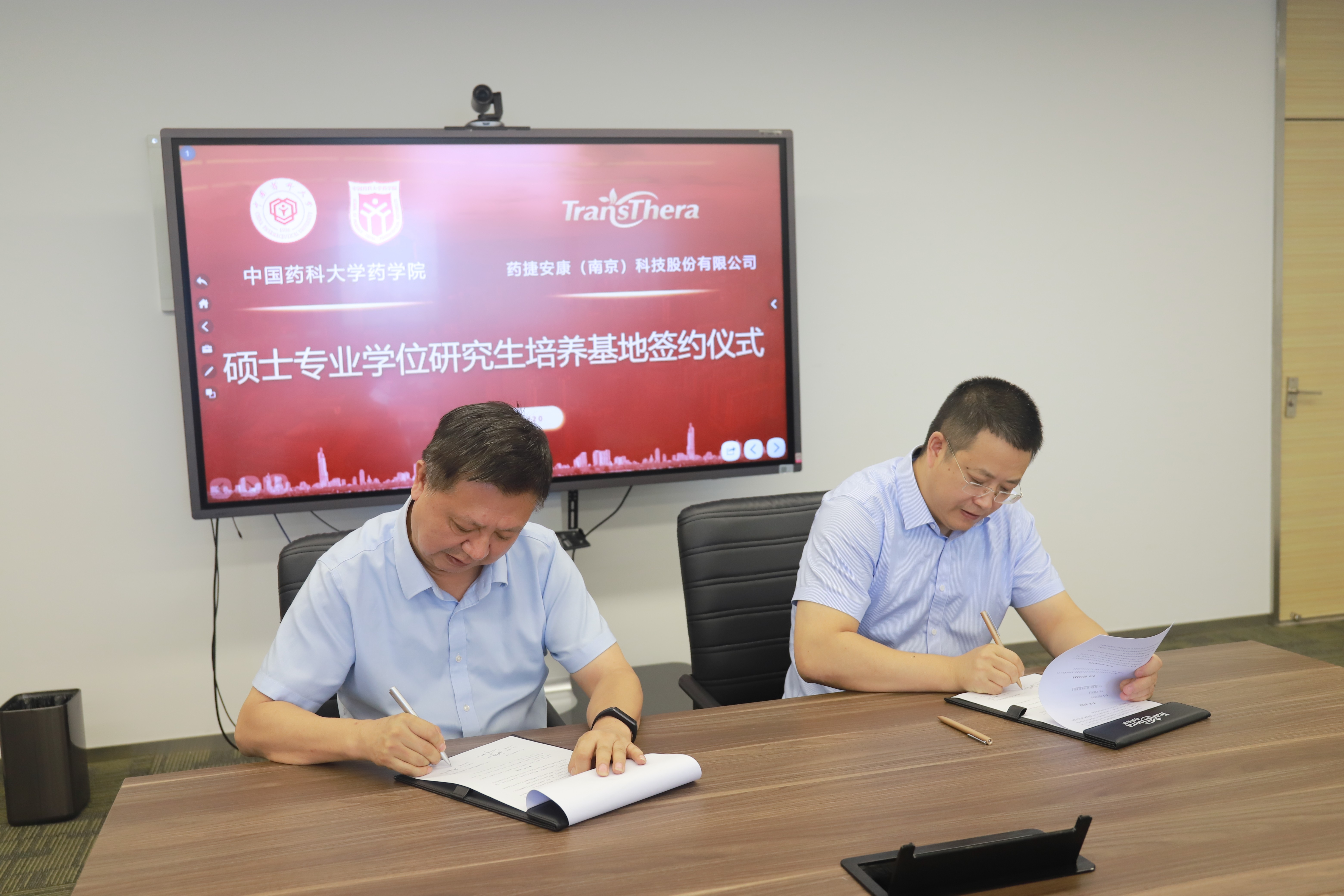 7月20日下午,太阳成集团tyc7111cc与药捷安康科技股份有限公司共建硕士专业学位研究生实践基地签约揭牌仪式在药捷安康科技股份有限公司(以下简称药捷安康)举行。药捷安康董事长吴永谦、项目管理副总裁彭鹏博士、生物副总裁盛泽娟博士、临床执行总监孙彩霞博士、运营副总裁崔松喜等,以及太阳成集团tyc7111cc经理姚和权、研究生院副经理胡庆华、原创药物技术创新研究院副经理杨鹏、太阳成集团tyc7111cc药物化学系卞金磊教授、太阳成集团tyc7111cc药物化学系徐盛涛副研究员等出席仪式并共同见证签约揭牌。
