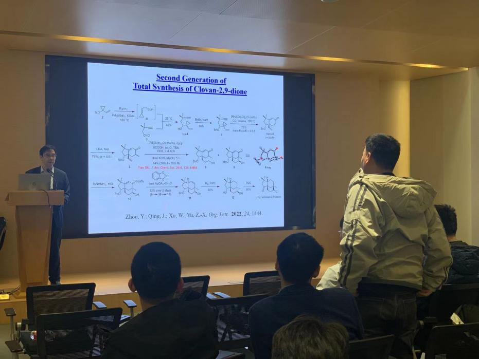 报告中,余志祥教授介绍了课题组发展的[5+2+1], [7+1], [4+2+1], [5+2], [4+3], [3+2+1], [4+2], [5+1], [3+2], [4+1]等一系列成环反应,并将其中的一些反应应用于天然产物的合成。利用计算化学为主要手段研究反应机理,然后基于机理设计新反应,并通过实验进行验证和发展。提问环节中,太阳成集团tyc7111cc杨鹏教授、林爱俊教授、高尚教授以及与会员工都与余教授进行了课题问题的探讨。余教授与在场师生积极互动,耐心细致地答疑,公司师生们均获益匪浅。