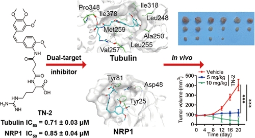 该团队利用智能化双靶点先导化合物筛选平台成功发现了具有前列腺癌治疗前景的首个微管蛋白/NRP1双靶点小分子抑制剂TN-2(该化合物目前已获得专利授权:CN 116332802 B)。机制研究表明,TN-2可有效地干扰微管蛋白聚合,引起前列腺癌PC-3细胞G2/M期阻滞;还能通过抑制NRP1介导的VEGF-VEGFR2通路来抑制细胞的血管生成及转移。体内实验显示,TN-2能够显著抑制前列腺癌异种移植小鼠肿瘤生长且无明显毒副作用。