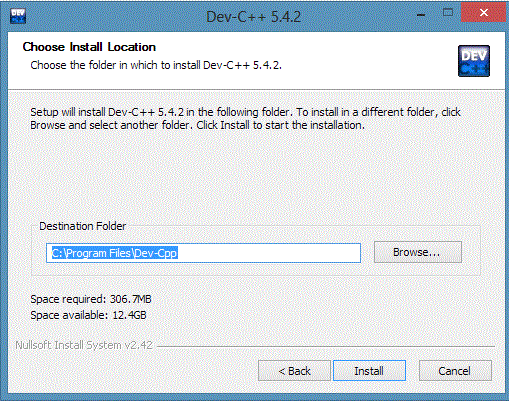 • Install windows pops up. Choose the location where you want Dev-C++ to be installed and then click on Install.